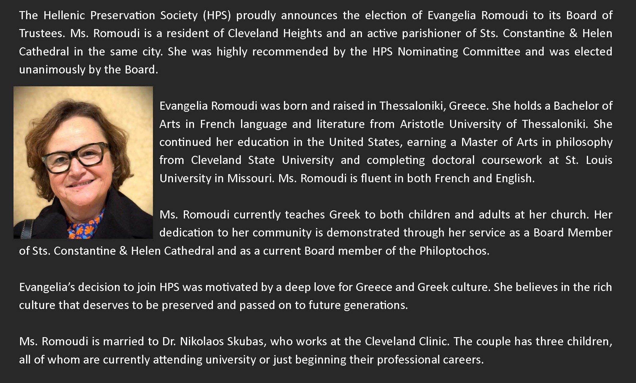 The mission of the Hellenic Preservation Society is to present a unified voice of the Hellenes in Northeastern Ohio that will promote the Greek experience through programs, presentations and cultural collections.