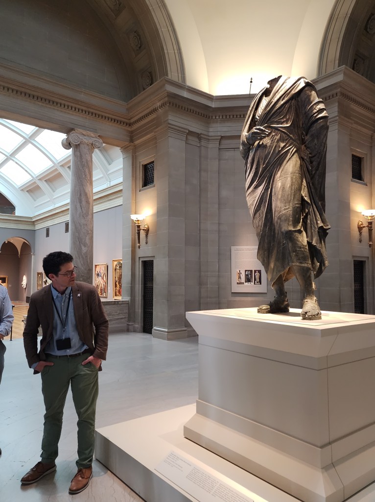Of unique interest on the tour was a headless bronze statue called The Philosopher, which is on final display at CMA before its return to Türkiye, where it was originally discovered in an archaeological dig at Bobon. Known to them as Marcus Aurelius this statue has caused an international controversy. Dr. Pevnick discovered it was actually another Emperor, possibly Lucius Verus, Aurelius’s co-emperor. The bronze was purchased by CMA in the 1960s from a supposedly-reputable dealer in NYC, but later the District Attorney in New York alleged it was looted from its original site. Further research and forensic analyses supported Turkiye’s claim. CMA agreed to return the statue, but will display it until July 8, 2025. Through no fault of their own, this is an uncompensated loss to the CMA’s collection, but the CMA has heightened its diligence in assuring the provenance of new accessions, while respecting the cultural and sovereign traditions of other nations.