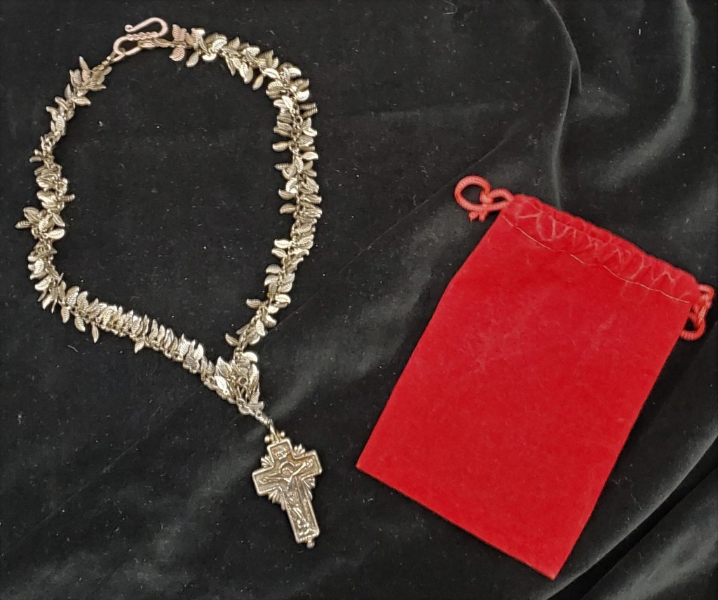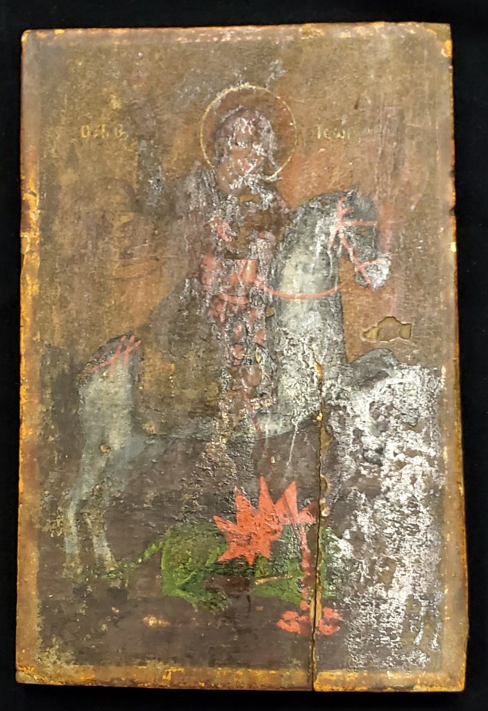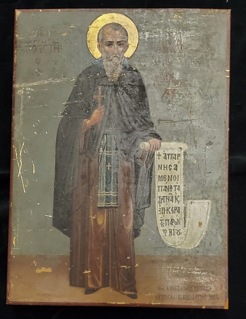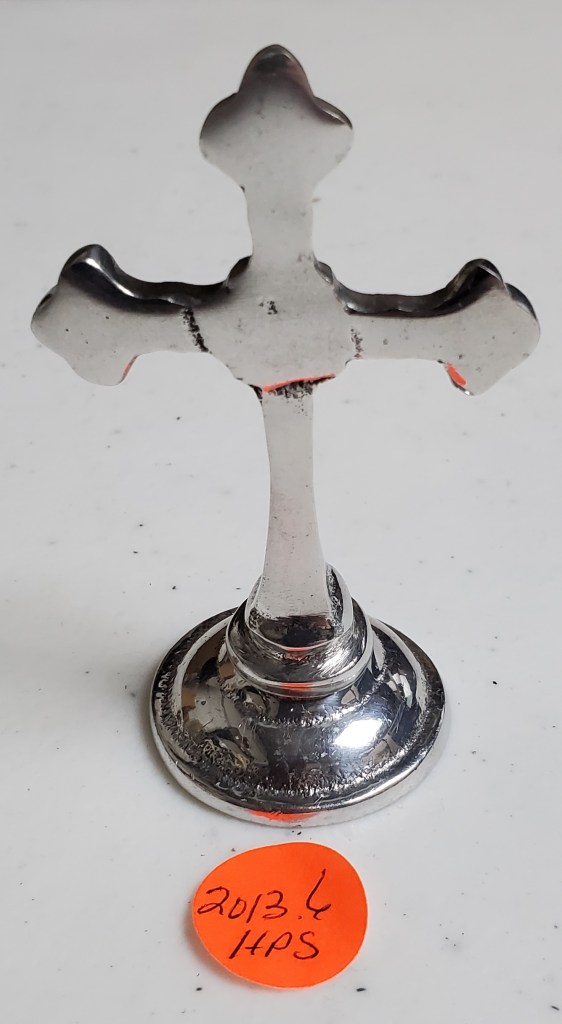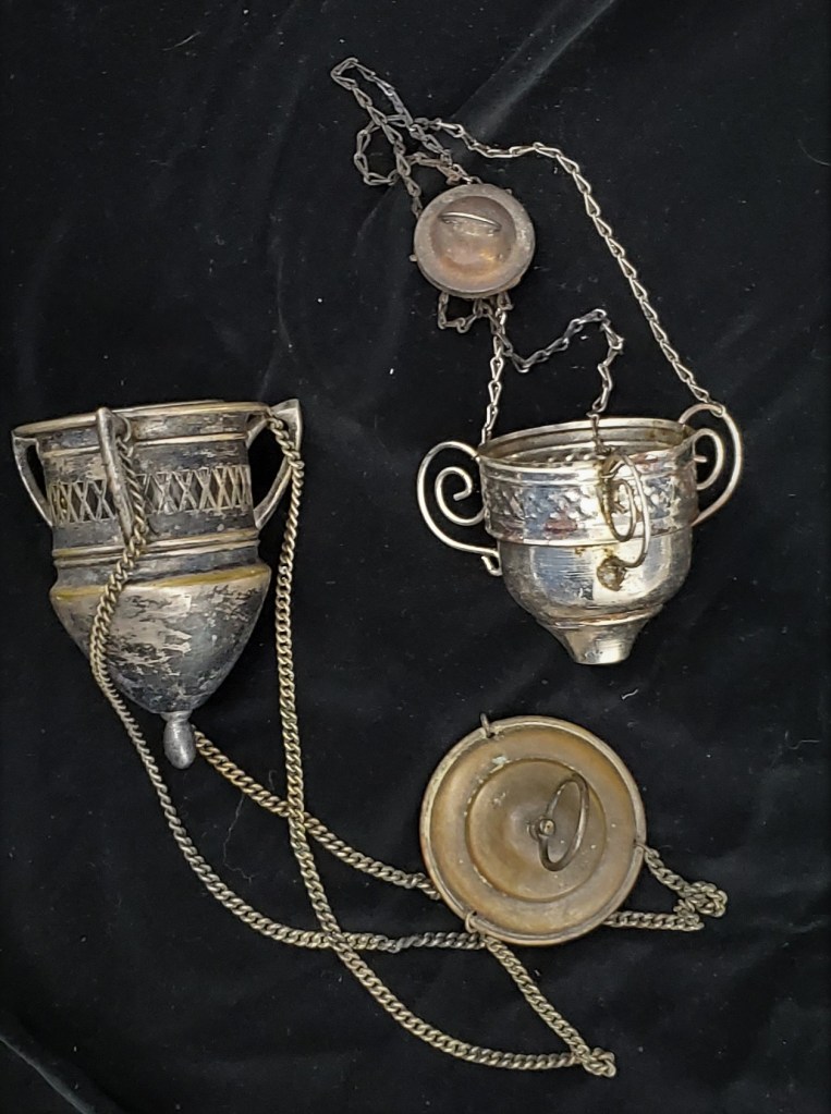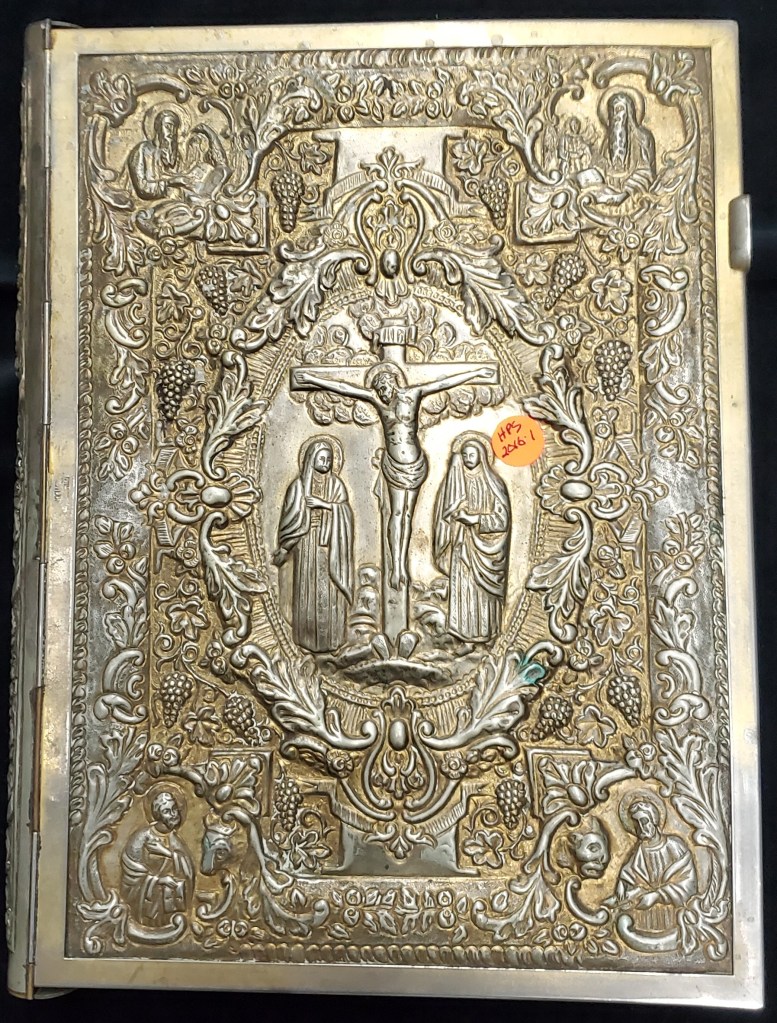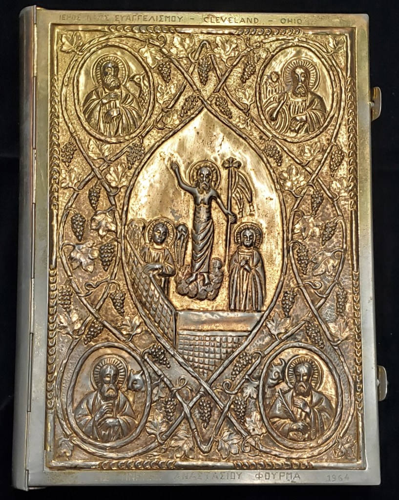 Framed in gold wood embroidered and upholstered cross with Greek and American flags. Gift of Paula AlexWood carved icon, 1925. Gift of Christine JanasΘΕΙΟΝ ΚΑΙ ΙΕΡΟΝ ΕΥΑΓΓΕΛΙΟ (God and the Holy Gospel) ΕΝ ΒΕΝΕΤΙΑ ΕΚ ΤΗΣ ΕΛΛΗΝΙΚΗΣ ΤΥΠΟΓΡΑΦΙΑΣ ΤΟΥ ΦΟΙΝΙΚΟΣ (In Venice from the Greek typography of Finikos) Hand-chased silver cover. Printed on vellum, 1848. Gift of George DoutztsoglouSilver(?) Byzantine cross on pedestal. Belonged to Dimitra Arliss. Gift of Billie SutterSilver metal icon. Two hinged doors open to reveal the Virgin and Child (icon) surrounded by two angels. The icon is mounted in a recess. The font face is flanked by two spiral columns. Above the doors is an arch with an attached cross. The following “ΕΝ ΕΚΚΛ ΕΥΛΟΓΕΙΤΕ ΤΟΝ ΘΕΟΝ” surrounds the dove above the doors. Possible translations: You Bless God-In Church Bless God. On the back is a hinged support along with a hook for hanging. Gift of Billie SutterGold toned framed icon of Virgin and Child. The initials MP and OY are in the upper left and right of the Virgin’s halo. The icon is boarded by a flora decorative pattern. The icon is embossed metal (gold metallic finish) with cut out lithographic images of the hands and faces of the Virgin and Child. Gift of Billie SutterAltar cloth, early 20th c. Gift of Rose VourlisSilver bible, acq 2016Blue cloisonne Bible, 20th c. Gift of Sts. Constantine and Helen parish councilGold Bible with red velvet spine, early 20th c. Gift of Sts. Constantine and Helen parish councilPainted eggshell. Gift of George FikarisPectoral crossBrass bible, 1899. Gift of Rose VourlisIcon of St. George, early 20th c. Gift of Mary LiebenIcon, 1954. Gift of Rose VourlisCross with velvet pouch. Gift of Billie SutterOil lamp, late 19th c. Gift of Irene BatesPanagia icon, 1951. Gift of Rose Vourlis